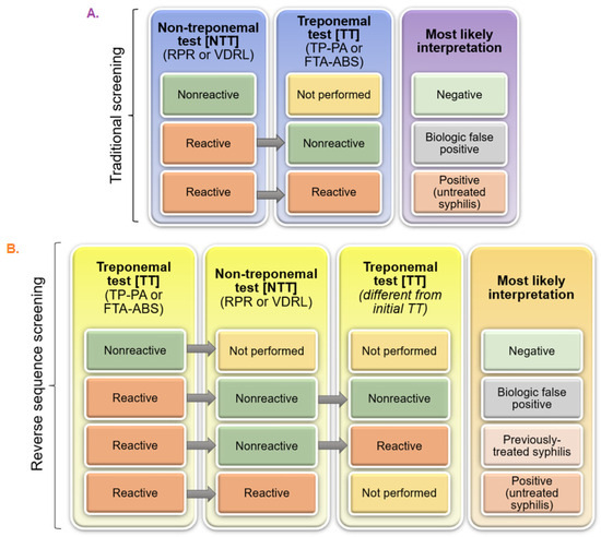 Non-treponemal serological tests (NTTs), such as rapid plasma reagin (RPR), are often used for initial screening, followed by treponemal-specific serological tests (TTs), such as Treponema pallidum-particle agglutination (TP-PA), for confirmation. This traditional algorithm of NTT first, then TT, remains the most common standard in resource-limited settings, since it is cost-effective [8]. However, “reverse algorithm” testing using automated treponemal-specific immunoassays, potentially followed by NTT and a different TT, is considered more efficient, and is becoming more widely used in high-prevalence settings [17,18]. These screening algorithms are illustrated in Figure 1.