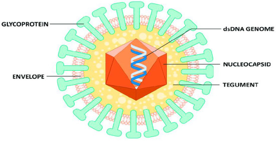 Human cytomegalovirus (HCMV) is the largest of the family Herpesviridae. It is prevalent across the globe and affects individuals of various age ranges, genders, and ethnicities [1]. HCMV leads to opportunistic infections (OIs) among individuals who have human immunodeficiency virus (HIV). It is globally endemic and rampant in developing countries [2,3] rather than in developed countries [4]. HCMV has been an important viral pathogen in humans for more than a century with manifestations ranging from asymptomatic in immunocompetent patients to severe end-organ dysfunction in immunocompromised patients with HCMV disease [5]. HCMV causes various life-threatening infections like chorioretinitis, pneumonia, enteritis, encephalitis, colitis and neuropathy [6]. HCMV can be transmitted by direct contact with bodily fluids such as saliva, tears, urine, stool, semen and breast milk [7]. HCMV is latent in most cases, but in immunocompromised individuals, the virus replicates exponentially and spreads throughout the body in the blood, causing cytomegalovirus (CMV) viremia and even organic CMV disease [8]. Detection of HCMV-specific IgM antibody is a diagnostic method for the detection of HCMV DNA by the use of polymerase chain reaction (PCR) test [9]. Below is the structure of HCMV (Figure 1).