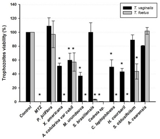 The mixture of extracts from the barks of plants X. americana, A. colubrina, M. urundeuva, S. obtusifolium, and A. cearensis (1:1:1:1:1) reduced the viability of the trophozoites by 79.2% and 66.9% for T. vaginalis and T. foetus, respectively (Figure 3).