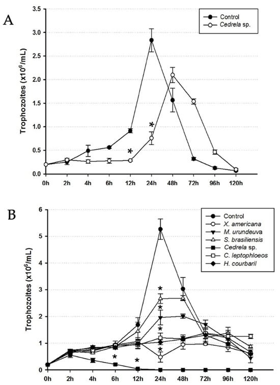 Effect of extracts from the barks of plants in the kinetic growth curve of (A) T. vaginalis and (B) T. foetus. Trophozoites treated with extracts of plants, at IC50 values, were counted in comparison to untreated parasites (control). The initial inoculum was 2.0 × 105 trophozoites/mL. Results are presented as mean ± standard deviation of three independent experiments in triplicate. * Satistically different from control (p < 0.05).