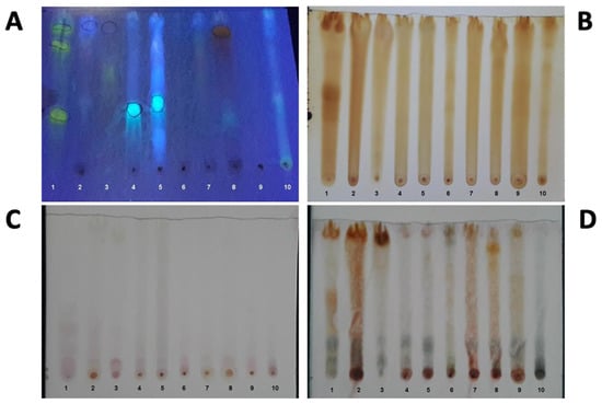 Revelation of the thin layer chromatography of the extracts with different developers. (A)—Natural reagent; (B)—Iodine vapor; (C)—Ninhydrin; (D)—Anisaldehyde. 1—crude extract of barks of Prosopis juliflora plant; 2—crude extract of barks of Ximenia americana plant; 3—crude extract of barks of Anadenanthera colubrina var. cebil plant; 4—crude extract of barks of Myracrodruon urundeuva plant; 5—crude extract of barks of Schinopsis brasiliensis plant; 6—crude extract of barks of Cedrella sp. plant; 7—crude extract of barks of Commiphora leptophloeos plant; 8—crude extract of barks of Hymenaea courbaril plant; 9—crude extract of barks of Syderoxylum obtusifolium plant; 10—crude extract of barks of Amburana cearensis plant.