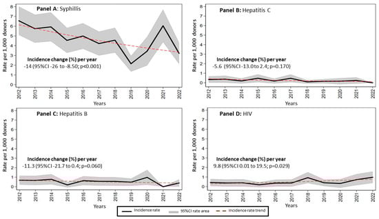 3.1. Prevalence of HIV, Hepatitis C, Hepatitis B, and Syphilis in Blood Donors between 2012 and 2022
