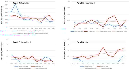 3.4. Incidence of HIV, Hepaitis C, Hepatitis B, and Syphillis Infection in Blood Donors per Sex from 2012 to 2022