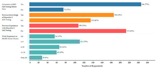 Figure 2 summarizes respondents’ professional healthcare experience and prior awareness of self-testing for hepatitis C and HIV. Over three-quarters of the respondents were aware of HIV self-testing before the survey, while about half of the respondents knew about hepatitis C self-testing, and only 34% of respondents had prior experience with hepatitis C self-testing. In addition,
