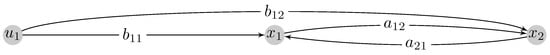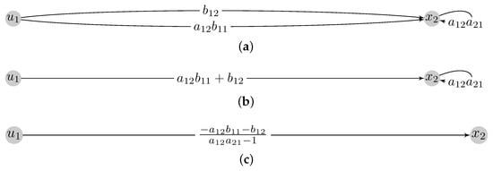 where is an array of variables and is an array of inputs. An SFG as introduced in [20] is a representation of Equation (1) in the form of a graph. However, to simplify the algebra [21], it is common to restrict the SFG to a linear form that represents a system of linear explicit algebraic equations written as when arranged in matrix form. However, it is easier to construct the SFG from the open form (Equation (2)) with every variable () given as the sum of all variables including itself () scaled by some constant plus the sum of all inputs () scaled by some constant .