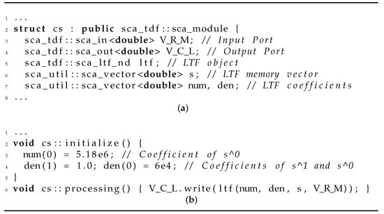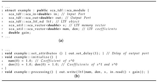 System-level behavioral model of the example in Figure 3 implemented in SystemC AMS with (a) example.h and (b) example.cpp.