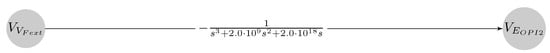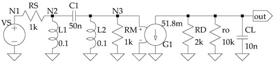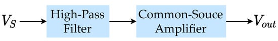 The behavioral block diagram of the circuit is given in Figure 6. The two blocks are represented by the LTFs of the HPF and of the CS amplifier’s SSM, which are given in Equation (4) and Equation (5), respectively.