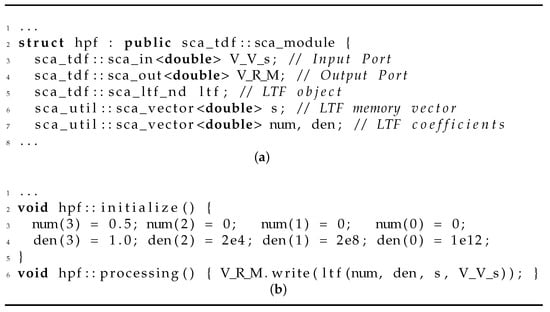 System-level behavioral model of the HPF implemented in SystemC AMS with (a) hpf.h and (b) hpf.cpp.