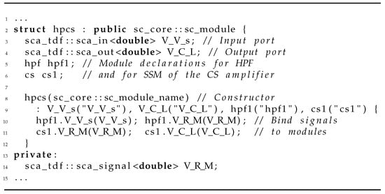 The system-level model of the circuit is based on this block diagram and is implemented in SystemC AMS. Two TDF MoC modules are used to model the two blocks. The implementation of the HPF and the CS amplifier is given in Figure 7 and Figure 8, respectively. As both blocks are represented by single LTFs, they are implemented by a single LTF object sca_tdf::sca_ltf_nd. The modules are then connected in the parent module hpcs given in Figure 9. The declarations of the modules are at lines 5 and 6, and they are connected with the signal V_R_M at lines 10 and 11.