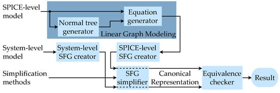 A block-diagram overview of our methodology for equivalence checking between system-level and SPICE-level models is seen in Figure 10. To generate a complete set of equations from the netlist, we use the linear graph modeling method [25], which consists of a normal tree generator and an equation generator. We chose this method of analysis as it preserves the structure of the circuit the best and loses the least amount of information. We then create an SFG of the circuit with our SPICE-level SFG creator and an SFG of the SystemC AMS description with our system-level SFG creator. We then reduce these SFGs to a minimal canonical form with our SFG simplifier. The simplification methods of the SFG simplifier are detailed in Section 4.4 and consist of the removal of a non-input node, parallel edge elimination, and reflexive edge elimination. Our equivalence checker compares the two canonical SFGs. All these manipulations and transformations are statically performed and are not simulation-based.