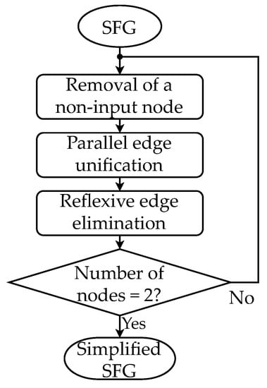 The created SFGs from the system-level and SPICE-level implementations are reduced to their canonical form by the block called “SFG simplifier”. The flowchart of the SFG simplification process is given in Figure 11 and consists of the simplification rules given in Section 3.2. These are applied by the SFG simplifier repeatedly in the given order until a minimal graph with only a single edge between its input and output nodes is obtained.