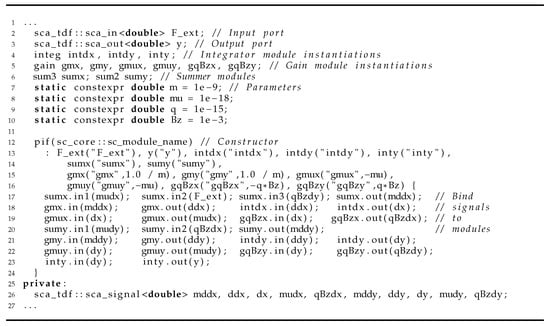 The system is implemented in SystemC AMS in a hierarchical manner. The top-level module which instantiates and connects all the sub-modules is given in Figure 18. All summer, gain, and integrator blocks are implemented as TDF MoC modules. The integral operations in the block diagram can be represented by LTFs with the value . These are implemented with sca_tdf::sca_ltf_nd objects in a similar fashion to the previous examples. The gains and summers are implemented with multiplication and addition operators. The gain values of the gain blocks are specified in the constructor of the top-level module at lines 15 and 16.