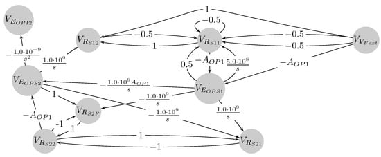 While the linear graph modeling approach uses substitution from this point on, we leave the equations as they are, and construct an SFG right away to preserve the structure of the circuit. Equations (7) and (8) are in the form of Equation (2), from which the SFG given in Figure 13 can be created.
