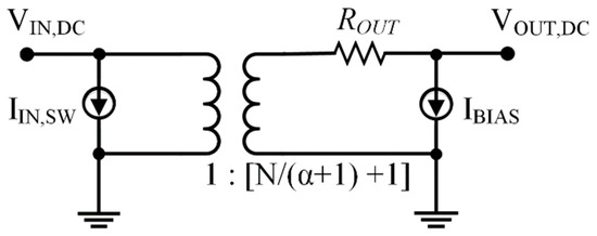 As shown in [5], considering the DC component of the input signal only, the CP in Figure 1 can be modeled using the equivalent circuit shown in Figure 2, whose output voltage DC component is VOUT,DC. The input current source, IIN,SW, models the switching losses due to the stray capacitance of the stage capacitors, and is expressed by