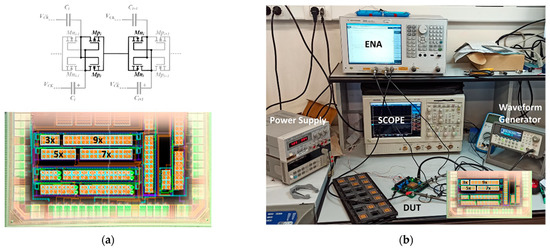 (a) Simplified circuit diagram of a stage of the CP (top) and layouts of the CPs superimposed on the chip photo (bottom); (b) experimental setup.