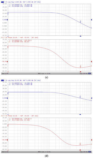 The value of the gain is confirmed in Figure 6, which reports the measured frequency response of the same samples. From this figure it is apparent that the CPs behave like a single-pole system with a GBW equal to 48.38 kHz, 36.32 kHz, 31.81 kHz and 30.27 kHz for the 2-, 4-, 6- and 8-stage CP, respectively.