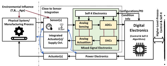 Particular emphasis is exerted on a suitable electronics design, as the lowest and decisive system level in a self-X hierarchy (see Figure 2). In particular, integrated solutions can benefit greatly from the realization of such an approach, as the costly one-by-one discrete calibration of systems will be replaced by an in-built redundancy, reconfiguration and correction features based on adaptation or learning/optimization techniques on various levels of abstraction. One prominent industrial example is the research of Synopsys, including the former work from Moortec, with Silicon Lifecycle Management (SLM) based on in-built sensing devices and corresponding control loops in their complex chips (SoCs) along with long-term data collection [21,22,23,24].