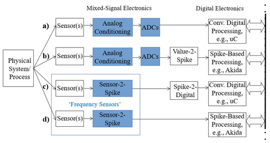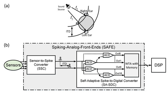 Time-to-digital converters have successfully established themselves [36]. Spiking AFEs (SAFEs) with adaptation features embedded in the same self-X concepts given above for their conventional counterparts are a promising and potentially technology-agnostic direction of development [37,38], interfacing to both conventional and neuro-inspired computing systems (see Figure 3).