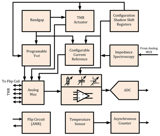 The key features are the general reconfigurability of both connectivity and analog properties as well as actuation options, e.g., the flip current control for AMR chips. Sensor sensitivity could be self-monitored, and, in case of a saturation issue, restored by a flip cycle (self-healing).
