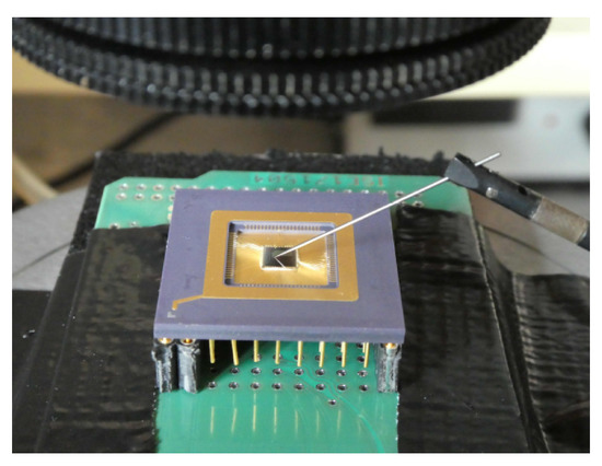 Photo of the USIX 2 chip on the wafer prober with test needle on FIB repair location.