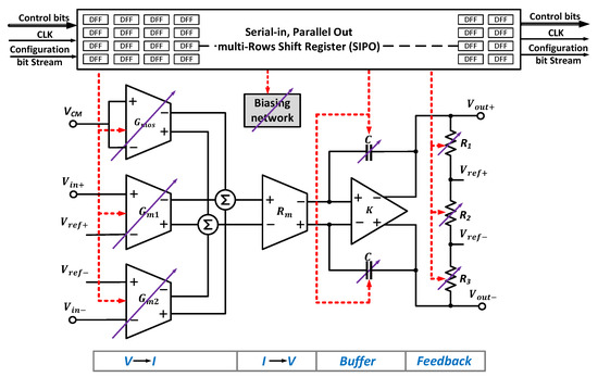 The instrumentation amplifier (in-amp) is the critical component of the AFE for signal conditioning in the amplitude domain for the sensors’ interface and readout circuitry [120,121]. Compared to the operational amplifier (op-amp), the main features of the in-amp are the high input impedance and common-mode rejection ratio (CMRR), making it the best choice for conditioning weak sensor signals in a noisy environment [122]. There are three major topologies for realizing the in-amp circuits [123]; those are the capacitive coupling chopper-stabilized in-amp (CCIA) [124,125], the conventional three op-amps based in-amp, and the indirect current-feedback in-amp (CFIA) [126,127,128].