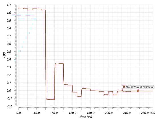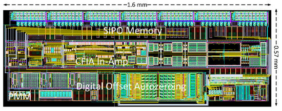 For precision amplification under high , an additional scalable transconductance stage () with a scalable current source is added to the CFIA input stage to run the digital-auto zeroing (DOZ) task using the optimization algorithm. Compared to our former work implemented in [157], both minimized the offset voltage () below 100 V. However, the former design used switching-capacitor auto-zeroing, thus introducing the spikes’ disturbance at the output. A total of 100 bits are used for the CFIA configuration. In the recent chip, the in-amp is further supported by an automatic digital offset calibration scheme based on methodologies presented in [158,159,160], as shown in Figure 9. During the design, the statistical offset voltage () of the CFIA is first concluded by running the Monte Carlo simulation with a large number of samples (500 samples) under extreme voltage, temperature, and process variation conditions. The autozeroing circuit is designed and added to the CFIA to cope with the obtained maximum absolute value of ). Then, the MC is repeated because the autozeroing circuit itself can change the original value of the CFIA . The post-layout simulation gives a maximum of , while the designed automatic DOZ can treat up to . This should be enough to mitigate the additional offset due to the fabrication, packaging, and aging effect. During the calibration mode, the gain of the CFIA is set to the maximum (128). Therefore, the offset voltage of the digital loop control will be divided by this value. Figure 10 shows the offset correction under the imported worst statistical corner from MC samples. Considering the CFIA setup gain, the result proved the offset voltage down to . The physical implementation of the complete circuit is shown in Figure 11, where the PMM stands for the power monitoring module, which will be discussed later.