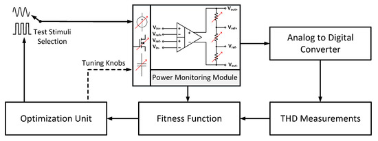 Compared to the optimization of digital evolvable hardware such as the field-programmable gate array (FPGA), the optimization of evolvable analog circuits at the transistor level may result in harmful solutions in terms of excessive currents that could cause a permanent failure of the DUT or reduce its life cycle. To alleviate this issue and enhance the long-term reliability, we recently embedded the low-cost indirect power monitoring module (PPM) with THD-based optimization methodology [173], as shown in Figure 14. The PPM serves two essential functions. Firstly, it helps the optimization algorithm to select the power-efficient solution. Secondly, it ensures accomplishing a safe reconfiguration pattern for the DUT. Without the presence of PPM, it is also quite challenging to constrain the acceptable current density during the optimization process without sacrificing the optimizer’s exploring capabilities.