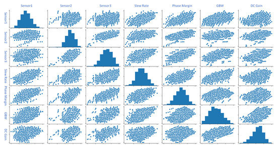 Another low-cost on-chip indirect measurement method using non-intrusive sensors is presented in [166,167,175]. The non-intrusive sensors are electrically disconnected from the main DUT but placed in close proximity to the DUT. Therefore, the optimization process can be performed without interrupting the device’s operation or affecting its performance. The operating conditions of these non-intrusive sensors are similar to the DUT, and their performance is designed to be highly correlated to the performance characteristics of the DUT. Hence, the DUT-targeted characteristics can be predicted from different characteristics of the non-intrusive sensors measured economically. For non-intrusive sensor design, the correlation among them should be as minimal as possible. Contrarily, their correlation with the targeted characteristics of DUT should be as maximal as possible. As observed from Figure 16, the correlation among the sensors themselves is significantly small, while it has a good correlation with the performance characteristics of the CFIA.