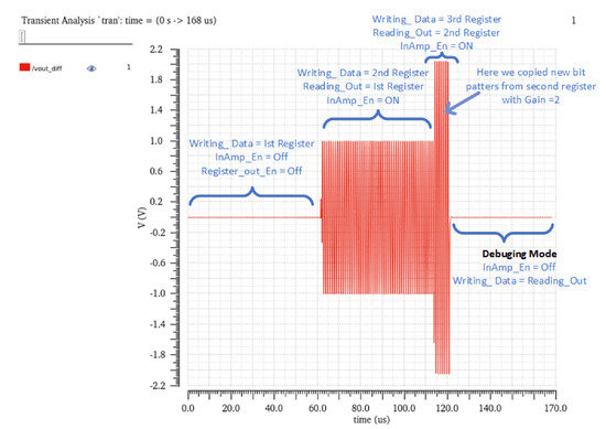 The CFIA circuits have been tested on the chip level by running various optimization solutions obtained from the circuit level. As it can be visualized in Figure 18, the CFIA received two different solutions with a gain setting of 1 and 2, respectively. Initially, the CFIA is powered down, and the output of the SIPO is disabled to ground until 65 s, whereby this time, the first row of the SIPO receives the complete optimization pattern. After that, the SIPO output from the first row is shifted to the CFIA in enabled mode, while the writing of the next optimization solution is carried out in the second row parallelly. Similarly, for the time from 115 s, the second optimization pattern is transferred to the CFIA, which changes the gain by a factor of 2, and the writing of the next optimization solution is now performed on the third row of the SIPO. The most significant bit of the selected row of SIPO has been exposed to the chip output to debug the downloaded configuration data on the SIPO memory, as shown in Figure 19. It can also be used for handshaking or as an acknowledgement in the communication protocol between the DUT and demonstration board. In a similar approach used for the CFIA, the filter circuit is tested for two different configuration patterns to change the cutoff frequency, as shown in Figure 20.