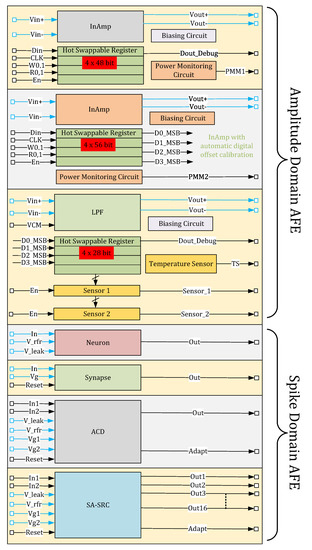 More flexibility and complete AFE functionality was provided by Field-Programmable-Analog-Arrays (FPAA), e.g., relevant FPAA commercial examples [79,80,81,82,83,84] and research examples [85,86,87,88,89,90,91,92,93,94,95], and representative AFE implementations [96,97,98,99,100,101].