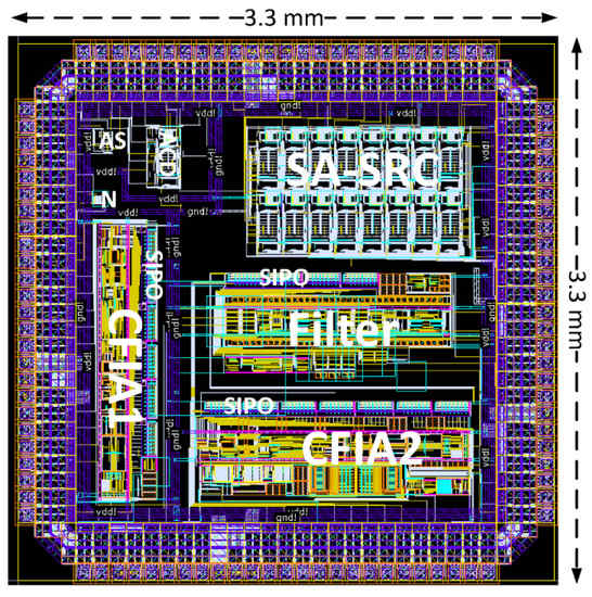The anti-aliasing filter comes in the next stage of the signal conditioning chain after amplification to remove the signal noise from the Nyquist bandwidth prior the ADC converter stage. To support an extensive bandwidth range also required for EIS, we proposed in [161] a fully-differential fourth-order tunable continuous-time active low pass filter based on the Sallen–Key structure with Butterworth approximation. The post-layout simulations proved a frequency range from to with a resolution of , while the filter quality factor is fixed to the well-matched capacitor ratios. This range is achieved by modifying the MOS floating resistor from [162] and by varying the MOS-resistor biasing current from to , as shown from the schematic diagram in Figure 12. However, tuning the filter in this range is quite challenging to perform. A general optimization method can be followed, such as in [105,163] to tune the frequency bandwidth. To reduce the measurement cost of the optimization process, we proposed the indirect measurement principle based on non-intrusive sensors in our chip, as will be discussed next. The core amplifier of the presented filter is the fully-differential DFF used in the design of the CFIA. A modification is worked around to reduce the amplifier output resistance as required by the Sallen–Key topology and also to extend the GBW up to to cope with the required filter frequency. The filter circuit’s physical implementation, including the programmable biasing current unit and the additional sensors, is shown in Figure 13.