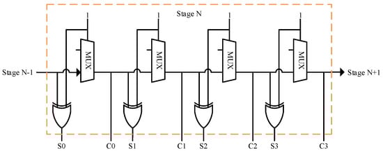 The design process regarding TDL implementations began with the identification of the elements that would enable picosecond-level resolution and implement the delay elements in the corresponding chain of the tapped delay line. FPGAs feature fast carry chains that can be used as delay lines for precise time measurement. Specifically, the FPGA used in the current work (Xilinx Virtex-6) had CARRY4 primitives that are usually employed for the implementation of fast adders. This arithmetic component included four sum outputs and four carry outputs, referred to in this paper as S[3:0] and C[3:0], respectively (Figure 2). These elements were arranged vertically inside the 12 clock regions of the FGPA, with 40 vertical primitives in each clock region. Documentation regarding the CARRY4 primitive employed to construct the delay line and its implications can be found in [34]. As noted in the work of Machado et al. [31], CARRY primitives are the most used delay elements regarding FPGA-based delay lines.