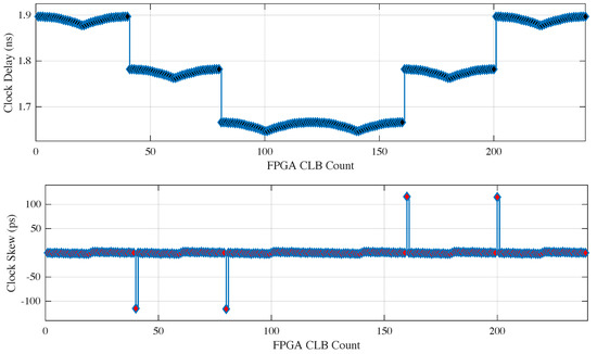 By analyzing the timing reports (obtained from the Xilinx ISE software) of the FPGA (Xilinx Virtex-6 w/ML605 board), we concluded that the best choice was to use both central clock regions of the FPGA (clock regions 3 and 4 out of the 6 vertical ones). This choice constituted a trade-off between the length of the delay line and the imposed skew, which had a maximum absolute value of 116 ps, in the sense that the longer the delay line the higher the possibility of crossing two clock regions with high skew. Figure 3 illustrates the clock signal distribution delay to each of the 240 vertical CLBs that were used to build the longest delay line possible to implement in the FPGA. Each clock region consisted of 40 CLBs on the vertical axis, and thus clock regions 3 and 4 corresponded to the FPGA CLB numbers 81–160. The clock skew exhibited maximum/minimum values on the crossings from one clock region to another, as depicted in Figure 3. The only adjacent clock regions that featured minimal skew that was substantially lower than the rest were the two middle ones. The four maxima/minima of skew imposed high nonlinearities when the START signal crossed the clock regions along the delay line, with the exception of the two central ones. In theory, the rest of the clock regions could also be employed for the implementation of a delay line, but only across one single region with only half of the dynamic range of a delay line with respect to the two central ones.