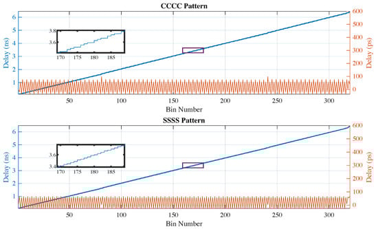 In Section 2.3, different sampling patterns are proposed for the construction of the delay line. The sampling pattern is defined as the combination of four or fewer outputs from the CARRY4 primitives that are used to construct a delay line. Regarding the patterns mentioned in this paper (e.g., CCCC), the most significant bit (i.e., the last output of the CARRY4 primitive) corresponds to the left-most bit and the least significant bit corresponds to the right-most bit. A downsampling pattern corresponds to a case where less than four outputs are used. As discussed later, the CCCC and SSSS patterns and their counterparts, CNCN and SNSN, and NCCC and NSSS, offered useful alternatives in cases where maximum resolution, minimum area, or minimum nonlinearity were desired. C and S denote the outputs of the CARRY4 primitive and N denotes an unused output. In addition, it should be noted that the LSB duration () varied according to the selected pattern, and thus the equivalent delays shown in Figure 1 also varied. The LSB duration is defined as the time difference between consecutive taps in the delay line. Furthermore, in order to implement a specific sampling pattern, the signals at the selected outputs of the CARRY4 primitives needed to be connected to the corresponding FFs. This was achieved with a custom “VHDL generate” statement for each delay-line implementation, without the need to add extra circuitry for selecting the CARRY4 outputs such as multiplexers.