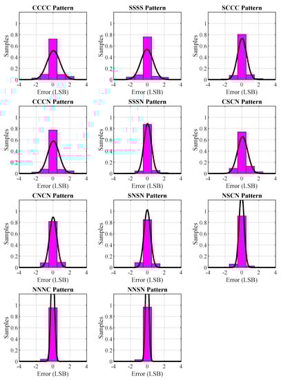 Although they did not exhibit the best linearity characteristics, the 4-tap patterns had the lowest , for example, the CCCC, SSSS, and SCCC ones. Furthermore, in order to optimize linearity and resource usage, a downsampled configuration can be chosen. For instance, the CCCN, SSSN, CSCN, or the CNCN, SNSN, NSCN patterns can be employed for improved linearity characteristics since these patterns offer the best (in terms of both DNL and INL) linearity metrics from the 3-tap and 2-tap patterns, respectively. The downsampled configurations also required fewer FPGA resources since both fewer FFs were required to sample the state of the delay line and fewer FPGA resources were needed for the implementation of the ones-counter. In an extreme case, where the minimization of resource usage of the design is the main objective, a 1-tap pattern can be employed. This aggressive downsampling configuration led to a much lower resolution, which was reduced by a factor of 4 compared to the 4-tap patterns. In this context, we also implemented all 1-tap configurations, with the NNNC and NNSN configurations exhibiting the best linearity characteristics.
