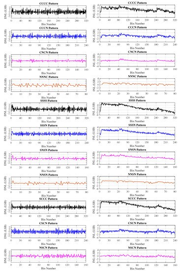 DNL (left side) and INL (right side) as a function of the bin number for the C-patterns, S-patterns, and tuned patterns.