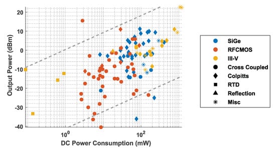 - Ono, N.; Motoyoshi, M.; Katayama, K.; Fujishima, M. 125 GHz CMOS oscillator controlled by p-type bulk voltage. In Proceedings of the 2012 IEEE Radio and Wireless Symposium, Santa Clara, CA, USA, 15–18 January 2012; pp. 215–218. [Google Scholar] [CrossRef]