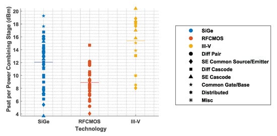 - Gu, Q.J.; Xu, Z.; Chang, M.-C.F. Two-Way Current-Combining W -Band Power Amplifier in 65-nm CMOS. IEEE Trans. Microw. Theory Tech. 2012, 60, 1365–1374. [Google Scholar] [CrossRef]