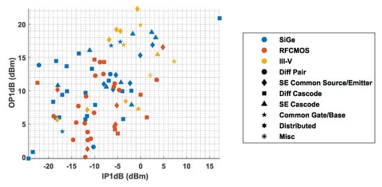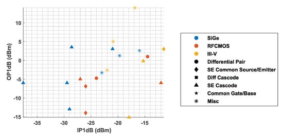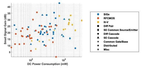 - Katayama, K.; Takano, K.; Amakawa, S.; Yoshida, T.; Fujishima, M. 14.4-dB CMOS D-band low-noise amplifier with 22.6-mW power consumption utilizing bias-optimization technique. In Proceedings of the 2016 IEEE International Symposium on Radio-Frequency Integration Technology (RFIT), Taipei, Taiwan, 24–26 August 2016; pp. 1–3. [Google Scholar] [CrossRef]