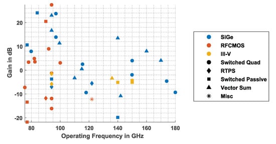 - Shahramian, S.; Baeyens, Y.; Chen, Y. A 70–100GHz direct-conversion transmitter and receiver phased array chipset in 0.18μm SiGe BiCMOS technology. In Proceedings of the 2012 IEEE Radio Frequency Integrated Circuits Symposium, Montreal, QC, Canada, 17–19 June 2012; pp. 123–126. [Google Scholar] [CrossRef]