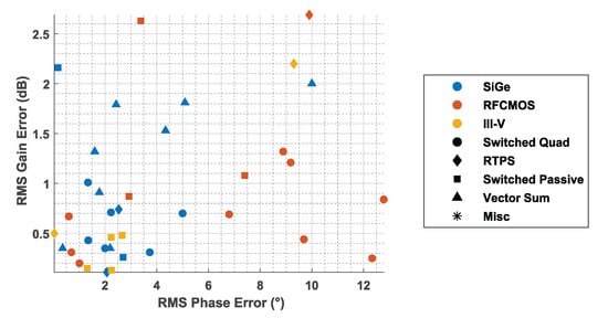 - Pepe, D.; Zito, D. Two mm-wave vector modulator active phase shifters with novel iq generator in 28 nm fdsoi cmos. IEEE J. Solid-State Circuits 2016, 52, 344–356. [Google Scholar] [CrossRef]