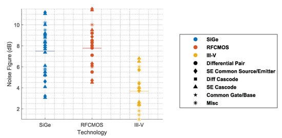- Liu, G.; Schumacher, H. 47–77 GHz and 70–155 GHz LNAs in SiGe BiCMOS technologies. In Proceedings of the 2012 IEEE Bipolar/BiCMOS Circuits and Technology Meeting (BCTM), Portland, OR, USA, 30 September–3 October 2012; pp. 1–4. [Google Scholar] [CrossRef]