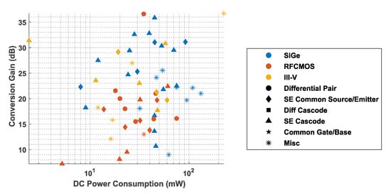 - Zhang, Y.; Liang, W.; Sakalas, P.; Mukherjee, A.; Jin, X.; Krause, J.; Schröter, M. 12-mW 97-GHz Low-Power Downconversion Mixer with 0.7-V Supply Voltage. IEEE Microw. Wirel. Compon. Lett. 2019, 29, 279–281. [Google Scholar] [CrossRef]