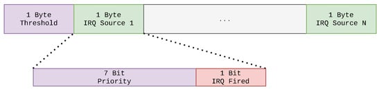 The PLIC [25] for RISC-V based processors describes an interrupt controller that multiplexes numerous device interrupts to the external interrupt lines of the processor. It was designed to support up to 1023 interrupts and is configurable with thresholds and priorities. Moreover, the PLIC allows to distinguish between different execution modes of the processor, as described in the privileged architecture specification of the RISC-V Instruction Set Architecture (ISA) [26]. Furthermore, up to 15,872 contexts can be handled by the PLIC, each context can either represent a single processor or a single thread within a multithreaded processor core. Inside the PLIC each interrupt source has a designated Identifier (ID) by which it can be addressed. When devices request an interrupt through the PLIC, the combination of priority, threshold, and ID is used to trigger interrupt notifications to each available processing unit. If two interrupt sources have the same priority, the source with the lower ID is selected over the source with the higher ID. A threshold can be set for each context, meaning each processor’s interrupt sources can be finely tuned to the needs of the application in which interrupts from various sources are handled by multiple processors. Lastly, the PLIC features a message sequence to handle interrupts by a targeted processor in order to notify, claim, and mark an interrupt as completed. At first, interrupts are claimed by a processor by reading the designated register from the PLIC, which returns the interrupt ID. Finally, the processor marks the interrupt as completed, by writing the interrupt ID the designated register in the PLIC. Lastly, while the PLIC Specification [25] defines that an arbitrary delay between an incoming interrupt and the notification of the processor is allowed, in this work we consider an interrupt controller with a single cycle delay.
