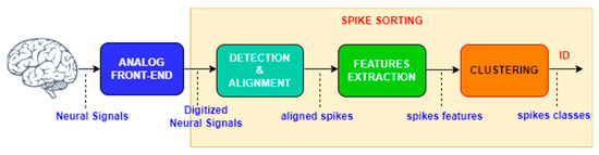 This processing chain is replicated many times to achieve a multichannel acquisition system, which is essential for monitoring several neurons belonging to different brain regions. The information acquired through such neural microsystems can be used for the prevention and treatment of many neurological diseases (such as epilepsy or Parkinson’s) and in the so-called brain–machine–interfaces (BMI) [5,6]. Therefore, the system is composed of a network of MEMS sensors which are devoted to the acquisition of neural signals, known as “action potentials” or “spikes”, for the realization of implantable multi-electrodes arrays (MEA). Then, the acquired very weak neural signals, with amplitudes in the order of 10 µV to 100 µV, are amplified and filtered before the A/D conversion process takes place because different cellular mechanisms are responsible for different frequency components of the recorded signals, as mentioned above. This chain is usually replicated several times in order to obtain a multi-channel system able to monitor wide brain regions and collect information from a high number of neurons. Communications between neurons happen through the aforementioned spike signals. Each microelectrode captures neural activity from multiple surrounding neurons. These extracellular recordings are called multi-unit activities because they involve spikes from different source neurons and are useful only in specific cases. However, several applications, ranging from clinical diagnostic and medical technology to BMI, which are used to control external devices such as neural robotic prosthesis and so on, require single-unit activity, that is, classification of spikes based on source neurons from which they were emitted. The process of classifying spikes with the corresponding source neurons, namely, the process of separating multi-unit activity into groups of single-unit activity, is called “spike sorting”, and it consists of three main phases: “Detection and Alignment”, “Features Extraction”, and “Clustering” [7,8,9,10,11,12].