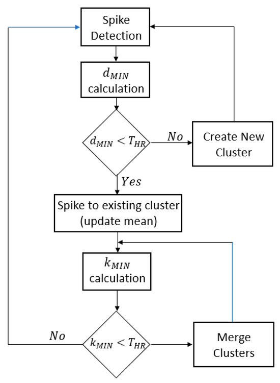The algorithm flow graph is shown in Figure 2. The incoming spike waveform is used as input, and the Euclidean distance is calculated between the incoming spike waveform with samples s(n) and the mean waveform of the existing clusters with samples c(n):