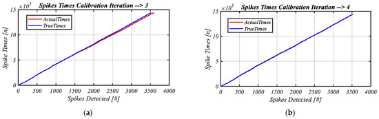Indeed, both and are 1-D arrays whose number of elements is the same as the number of samples of the detected spikes. By performing the difference between them, another array containing the corresponding difference can be obtained. This array is computed for each threshold used, and the index is used to identify the threshold value selected (extracted from the gradient curve) in the framework. The index corresponding to the minimum distance between the spike times is the one related to the optimal threshold. The result of this process can be observed in Figure 4, where the optimal threshold value is found after four iterations, and with this value, the real and actual spikes times are almost overlapped.