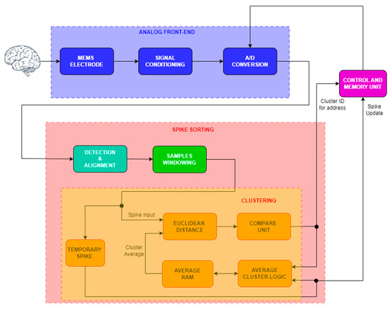 - Kalantari, F.; Hosseini-Nejad, H.; Sodagar, A.M. Hardware-Efficient, On-the-Fly, On-Implant Spike Sorter Dedicated to Brain-Implantable Microsystems. IEEE Trans. Very Large Scale Integr. Syst. 2022, 30, 1098–1106. [Google Scholar] [CrossRef]