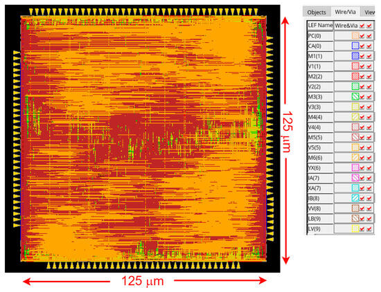 Detection and clustering blocks have then been placed and routed in the Cadence environment using the Innovus tool and referring to both the 130 nm and 28 nm technologies. The layout of the single channel digital processing chain implemented within the Cadence Innovus place and route tool in the 28 nm technology is reported in Figure 6, showing an area footprint as low as 125 μm × 125 μm.