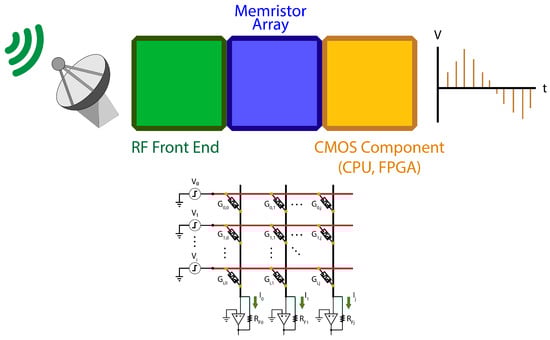 While memristors offer tremendous benefits in certain applications, they do not offer the same general-purpose capabilities of typical CMOS systems. In order to realize the benefits of a memristive accelerator in a non-laboratory environment, this technology should be integrated with other more traditional computing paradigms. Current research commonly utilizes custom-built peripheral circuitry to accomplish this task [11,13]. For a more tightly integrated system in a package, a chiplet architecture is a strong candidate instead of a monolithic system. A sample architecture for RF applications is shown in Figure 5 in which a CMOS SoC (System on Chip) handles general computing and a memristor array is directly connected to an RF front end for efficient processing of incoming signals.